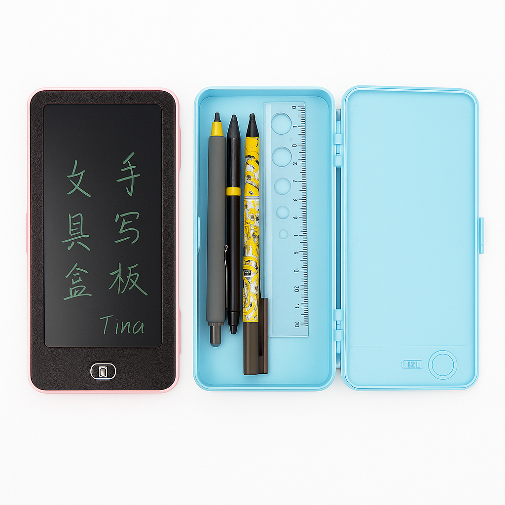“مقلمة + نوت باد… كل مذاكرتك في قطعة واحدة!” اكتِب، ارسم، وامسح بضغطة—وتخزّن أقلامك ومنظّماتك في نفس العلبة، جاهزة للمدرسة والدروس.